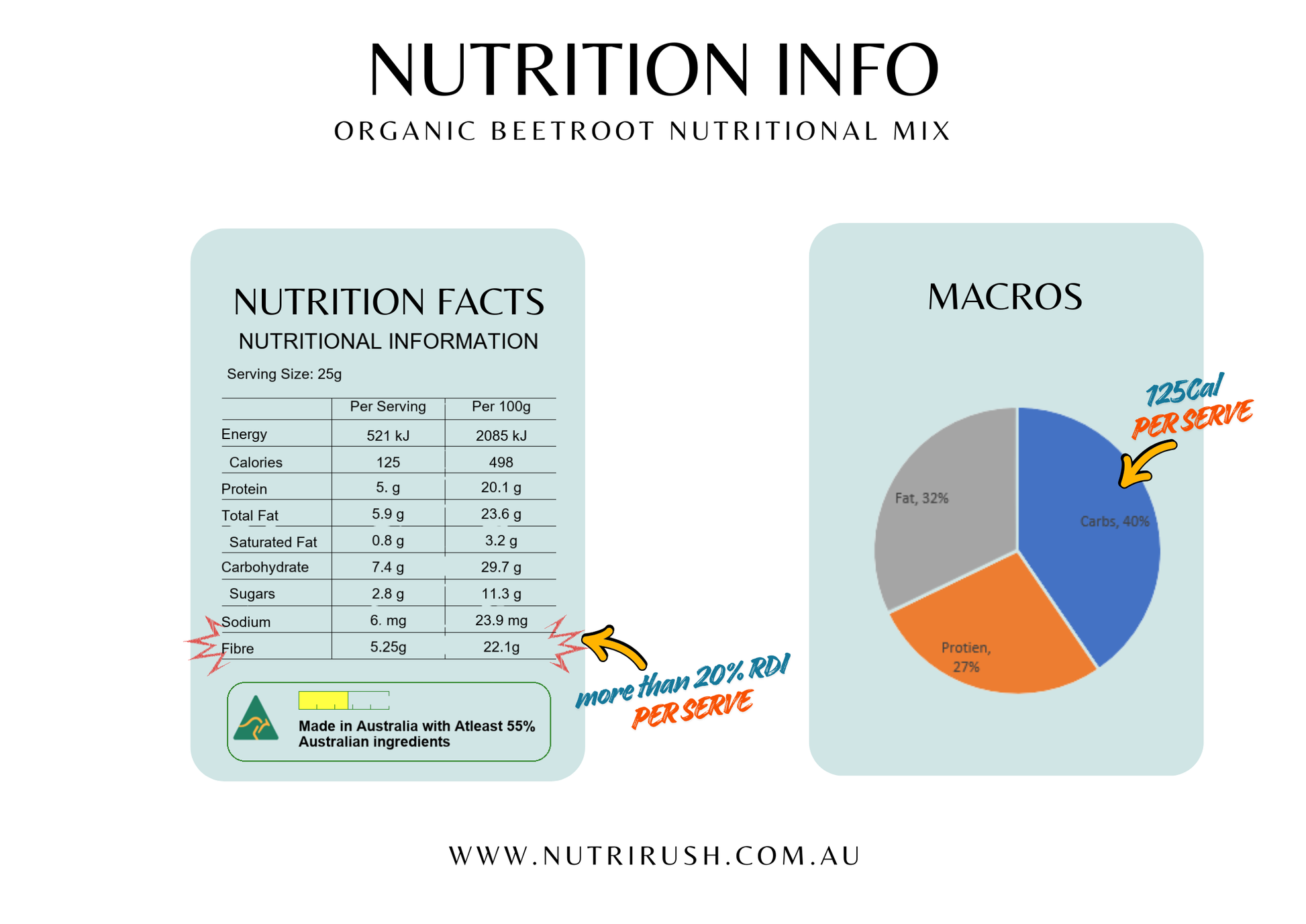 NutriRush is crafted for clean, balanced nutrition - plant-based fibre for satisfaction and macros for steady energy.